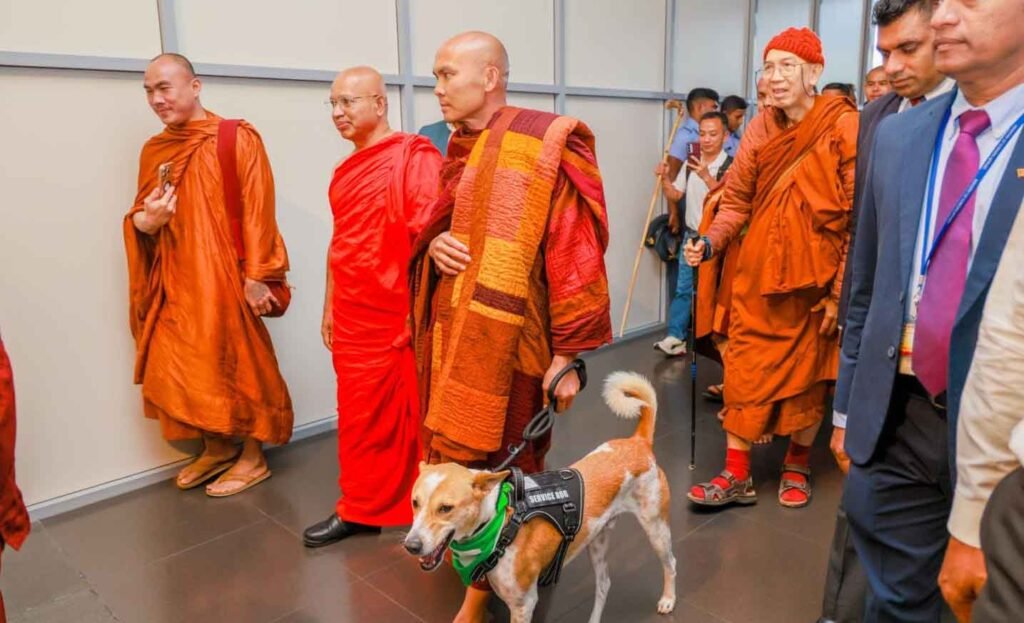 The group, consisting of seven venerable monks, arrived in the country this morning (April 21) to begin the globally recognized spiritual journey aimed at promoting peace and unity. Adding a symbolic touch to the procession is “Aloka,” a dog accompanying the monks, who also safely reached Sri Lanka.